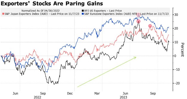 彭博美元指数正走向7月份以来最糟糕的一个月,此前美联储暗示,其长达近两年的紧缩周期可能即将结束,这促使交易员加大了对明年降息的押注。日本和欧洲出口商指数,以及许多亚洲同行的指数,在今年头8个月反弹后,已从近期高点回落。