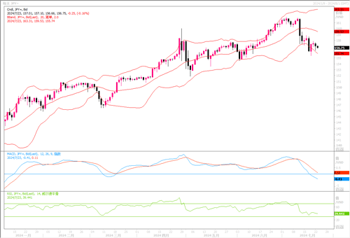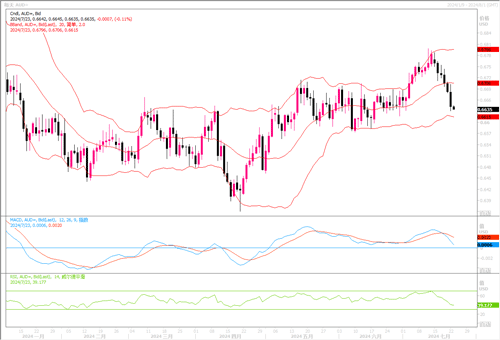 周一(7月22日),澳元兑美元下跌0.7%,收盘于0.6640美元。美国总统大选的不确定性导致亚洲股市下滑,另外中国意外下调市场利率对人民币构成压力,也令澳元产生膝跳反应。与此同时因需求前景悲观导致铜、铁矿石等大宗商品价格一再下滑,也是对作为商品货币的澳元构成重压。日线图上,澳元/美元隔夜继续大幅回撤再次将汇价推低接近布林带通道下轨线,MACD、RSI等技术指标向下倾明显,显示澳元近期走势偏弱。目前汇价再度回落到此前的震荡横盘区间内,预料若无利好消息刺激,澳元/美元大概率会复刻横盘震荡的走势,波动区间将陷于0.66-0.67之间。