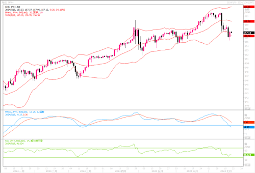 周五(7月19日),美元兑日元盘中继续略回升0.07%,收盘报157.48,在数据显示日本通胀率连续第二个月回升后,美元兑日元盘中在涨跌之间游走,全周来说下跌了0.24%。而且周五日本央行发布的债券市场小组会议纪录显示,会谈建议将日本公债购买量降至每月3-4万亿美元,消息给到日元一定的支撑。但如果7月底的日本央行利率会议上,日本当局仍无加息的举动,恐怕日元仍会遭遇一定的压力。从日线图上观察,美元/日元继续徘徊于布林带通道下轨线附近,技术指标仍保持着下倾,显示近期这轮美元/日元的下行势头暂时未有改变走向的迹象。当前55日均线(157.75)是美元/日元反弹的第一道关键阻力位,下一道阻力位于 158.84,而近期支撑位分别在 156.83、155-155.20以及周四低点为155.38。