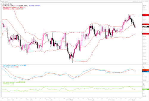 周五(7月19日),近期受广泛的避险情绪拖累以及美债收益率在长期疲软后回升,削弱了澳元兑美元的走势。全球股市下跌打压对风险敏感的澳元,澳元/美元跌至0.6690,0.6690是7月3日以来的最低水平(0.6664为当日低点)。此外,铁矿石(澳洲出口创汇主要来源)价格下跌也对澳元造成伤害。但据CFTC数据显示截至7月16日当周,澳元净头寸最近由空转多,是2021年5月以来首见。再加上美澳央行在货币政策上的预期分化,预料能帮助澳元限制住跌幅。日线图上,澳元/美元处于布林带通道中轨线之下,趋势稍稍不利于澳元的上行。但只要澳元/美元守护在0.6660之上,且汇价能重新回到0.6720之上,则澳元不至于陷入下行之中。