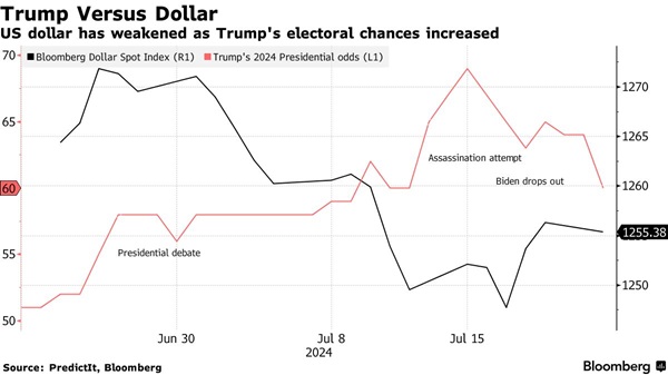 自美国总统拜登(Joe Biden)和特朗普在6月进行辩论以来,美元的走势基本上与特朗普获胜的几率相反。假如特朗普获胜的话,美元贬值将为他的经济计划创造“肥沃的土壤”。