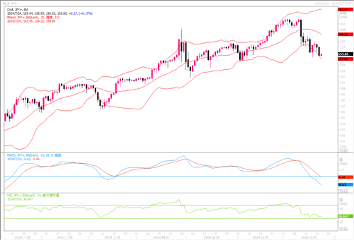 周二(7月23日),日元兑美元周二连续第二个交易日上涨,美元兑日元纽约盘尾下跌0.9%,收盘报155.62。执政自民党干事长茂木敏充表示,日本央行应更明确地表明货币政策正常化的决心,包括稳步加息。日本央行下一次公布利率决定的时间是7月31日。接受路透调查的大多数经济学家预计,日本央行将在此次会议上按兵不动。显然,市场正在为日本央行的决定做准备,日元近期的回升表现有点投机性押注做空美元的味道。周二来自美国的数据显示,美国6月成屋销售下降5.4%,经季节调整后的年率为389万户,为12月以来的最低水平。与此同时,成屋价格中位数较上年同期急升4.1%,创下42.69万美元的纪录新高,为连续第二个月创新高。但美元显然对数据的反应不大。受日元利率有望进一步提升的预期影响,日元兑其它主要货币的套利平仓交易渐渐展开,这对日元形成一定的支撑。日线图上,美元/日元继续沿布林带通道下轨线下行,技术指标保持下倾,显示美元/日元的回撤行情在延续之中。下方留意155.00水平的支撑,一旦跌穿,回撤幅度将进一步拓深。上方若是重回到160之上,那么日元的弱势或将会继续着。