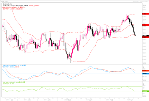 周二(7月23日),澳元兑美元跌至三周低位0.6612美元。受套利交易平仓日元走强的影响,澳元/日元交叉盘中走弱,间接拖累澳元/美元的表现,使得澳元近期的下行之势不断延续着。而且近期大宗商品价格的不断下滑,继续不利于澳元。此外,澳联储8月加息的概率不高,使得之前被认为有利差优势的支撑开始遭到削弱。本周三开始,美国还将有一系列重磅经济数据公布,数据的强弱预料也会对澳元造成一定的影响。日线图上,澳元/美元跌至布林带通道下轨线,技术指标严重下倾,显示澳元抛压沉重。短线存在超卖,目前就看此前横盘波动区间的下沿0.66能否给与较坚实的支撑。一旦失守,澳元弱势将会延续。