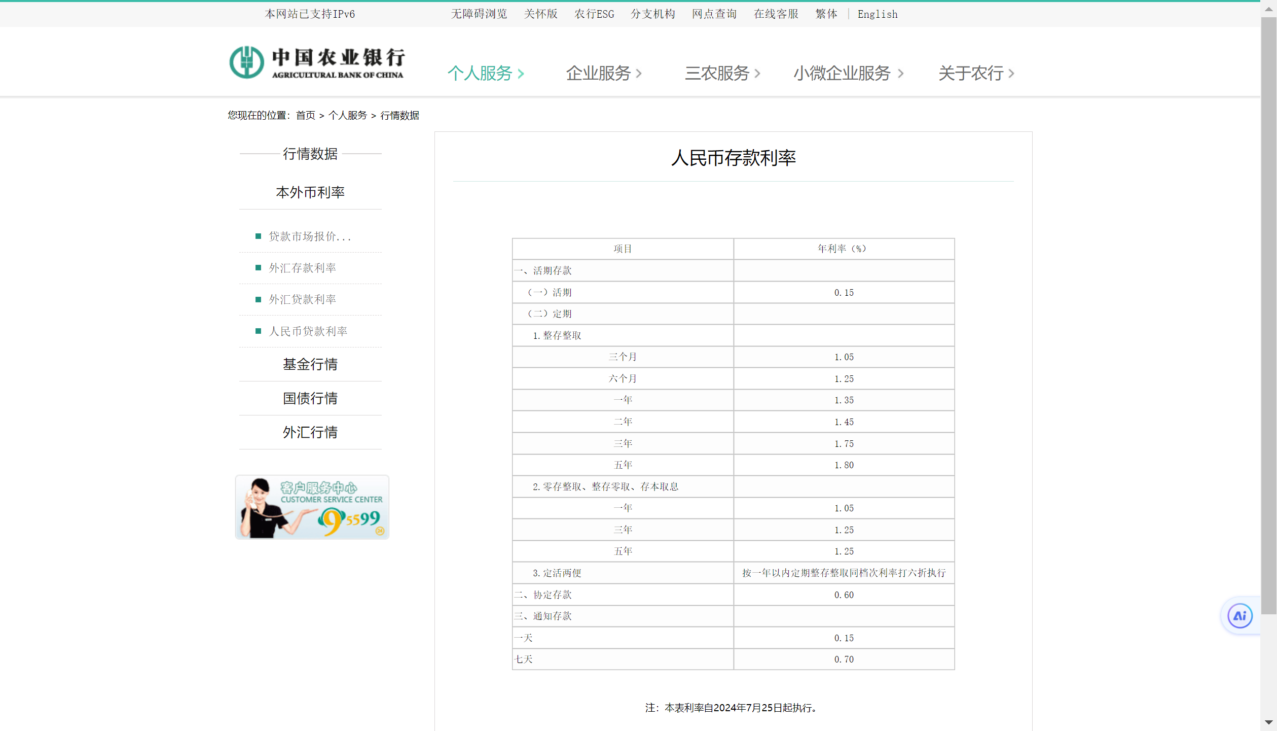 每经AI快讯,中国农业银行(601288)官网显示,农行于7月25日下调了人民币存款利率,其中定期整存整取三个月、半年期、一年期利率均下调10个基点,分别为1.05%、1.25%、1.35%;二年期、三年期、五年期利率分别下调20个基点,至1.45%、1.75%、1.80%。零存整取、整存零取、存本取息利率下调10个基点,通知存款挂牌利率下调10个基点。