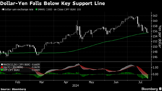 美元兑日元自3月中旬以来首次跌破100日移动均线,也跌破了心理关口155,技术指标显示这一势头可能还会持续。澳元、新西兰元和墨西哥比索兑日元均下跌1%。