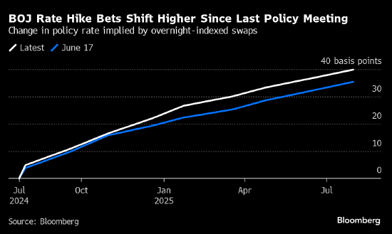 隔夜指数掉期目前显示,日本央行7月31日结束为期两天的政策会议时,加息15个基点的概率为33%。