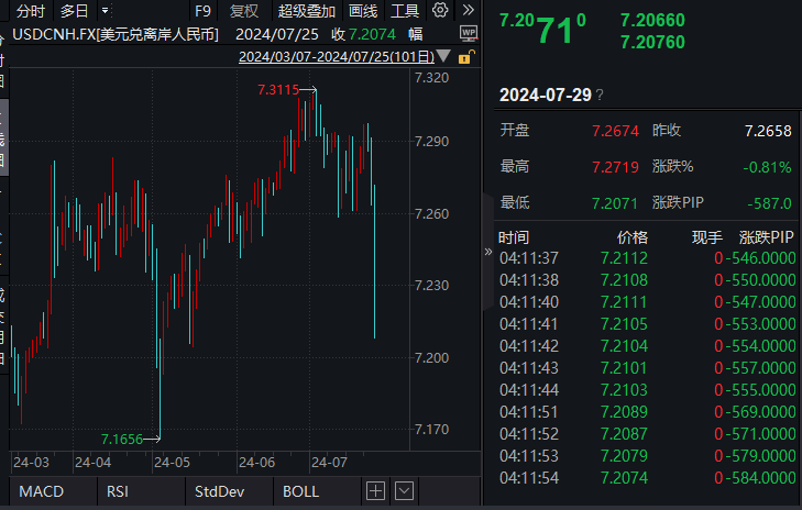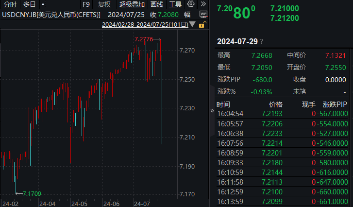 人民币大爆发的原因主要有三大方面:首先,央行下调OMO利率10BP,随后1年期和5年期LPR利率跟随下调10BP,今天MLF再度降息。此前市场认为监管层面在稳定汇率方面的权重比较重,所以降息并未发生,但在三中全会之后,这一压力似乎有所减轻。另一方面,我国二季度GDP增长低于去年同期,但重要会议提出今年5%左右的经济增长目标必须完成,市场解读为短期经济稳增长诉求正在提高,而且三中全会带来的改革预期也在减轻汇率的压力。