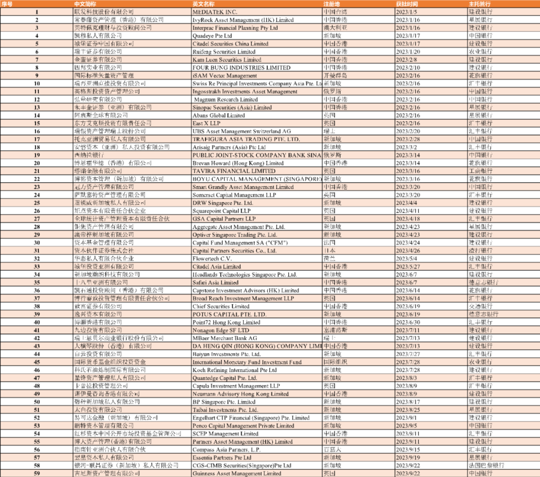 另据中国证监会官网,截至2023年9月底,今年已有59家机构获批为合格境外投资者。