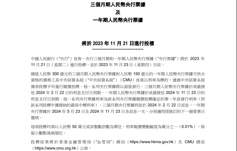 11月15日,香港金管局发文称,中国人民银行将会通过香港金管局的债务工具中央结算系统发行人民币央行票据。招标公告指出,中国人民银行宣布,央行三个月期和一年期人民币央行票据将于2023年11月21日进行投标,并于2023年11月23日交收。