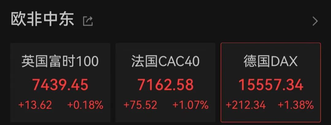 欧洲股市方面,主要股指盘中也是直线拉升,英国富时100指数翻红,法国CAC40指数和德国DAX指数涨幅扩大。据数据,截至北京时间14日22:27,英国富时100指数、德国DAX指数、法国CAC40指数分别上涨0.18%、1.38%、1.07%。