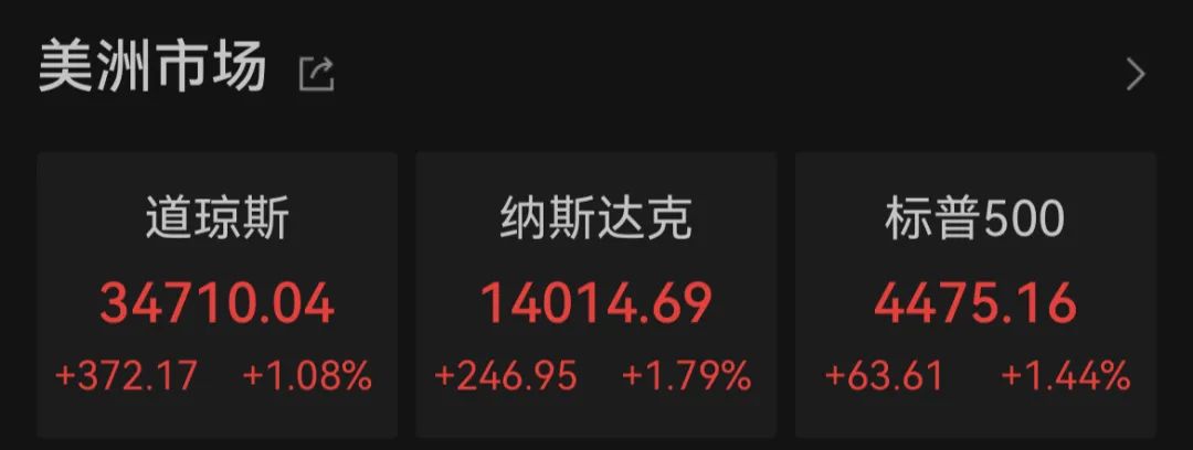 据数据,截至北京时间22:32,道琼斯工业指数、标普500指数、纳斯达克指数分别上涨1.08%、1.44%、1.79%。