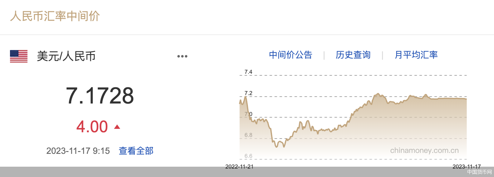 讯(记者廖蒙)11月17日,人民银行授权中国外汇交易中心公布,2023年11月17日银行间外汇市场人民币汇率中间价为:1美元对人民币7.1728元,前一交易日中间价报7.1724元,单日调降4基点。由此结束了人民币中间价连续升值的走势,本周内人民币中间价累计升值43基点。