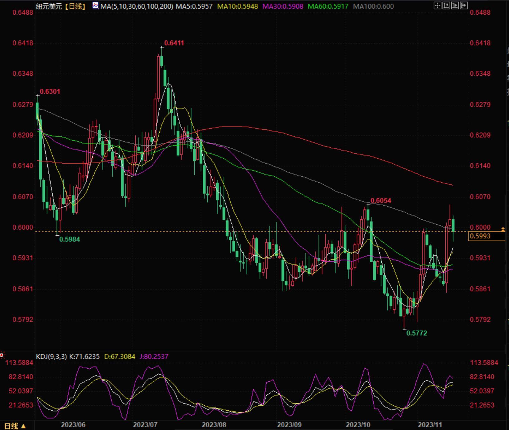 北京时间19:09,纽元兑美元报0.5994/96。