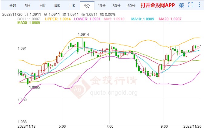 周一(11月20日)亚洲时段,欧元兑美元交投于1.0910,今日欧元/美元开盘于1.0911,截至发稿欧元对美元汇率报1.0910,上涨0.06%。
