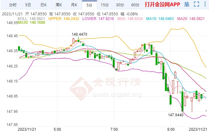 周二(11月21日)亚洲时段,美元兑日元最新交投于148.00附近,今日美元/日元开盘于148.3090,美元/日元汇率连续第四天仍面临一定的抛售压力,这也是过去六天中第五天出现下跌,并在亚洲时段跌至10月4日以来的最低水平。然而,现货价格在最后一个小时反弹了几个点,目前交投于148.00关口附近,但仍容易延长近期从152.00附近(即10月份触及的年初至今峰值)的回撤下滑。