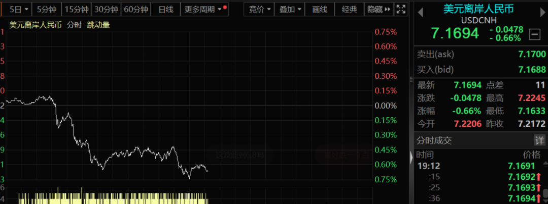 今天下午5点30分左右,在岸、离岸人民币对美元涨幅继续扩大,均升破7.17,日内分别涨超800个基点、500个基点。与此同时,美元指数亦出现杀跌,不过相对于人民币的涨幅,美元指数的跌幅并不算大。