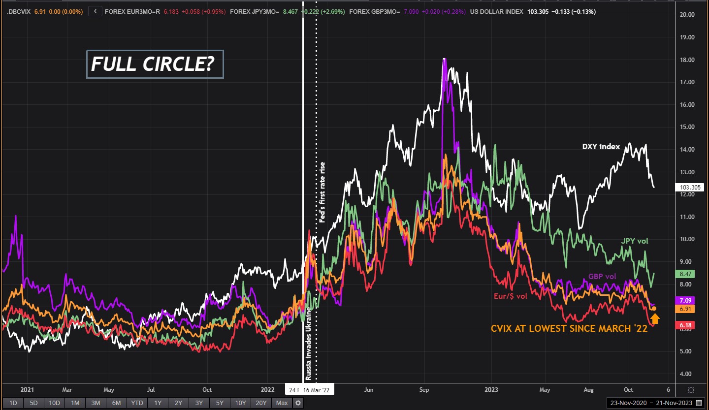 由于隐含波动率存在方向性偏倚,美元指数和CVIX通常具有良好的相关性,并在去年9月同月双双见顶。这种偏倚主要是由于美元走强的破坏性——通过大宗商品进口价格的通胀、以及许多新兴国家以美元计价的债务压力,美元走强加剧了全球经济、贸易和金融压力。这种偏倚反过来又制造了摩擦,往往会导致极端的货币政策、甚至引发公开的市场干预。