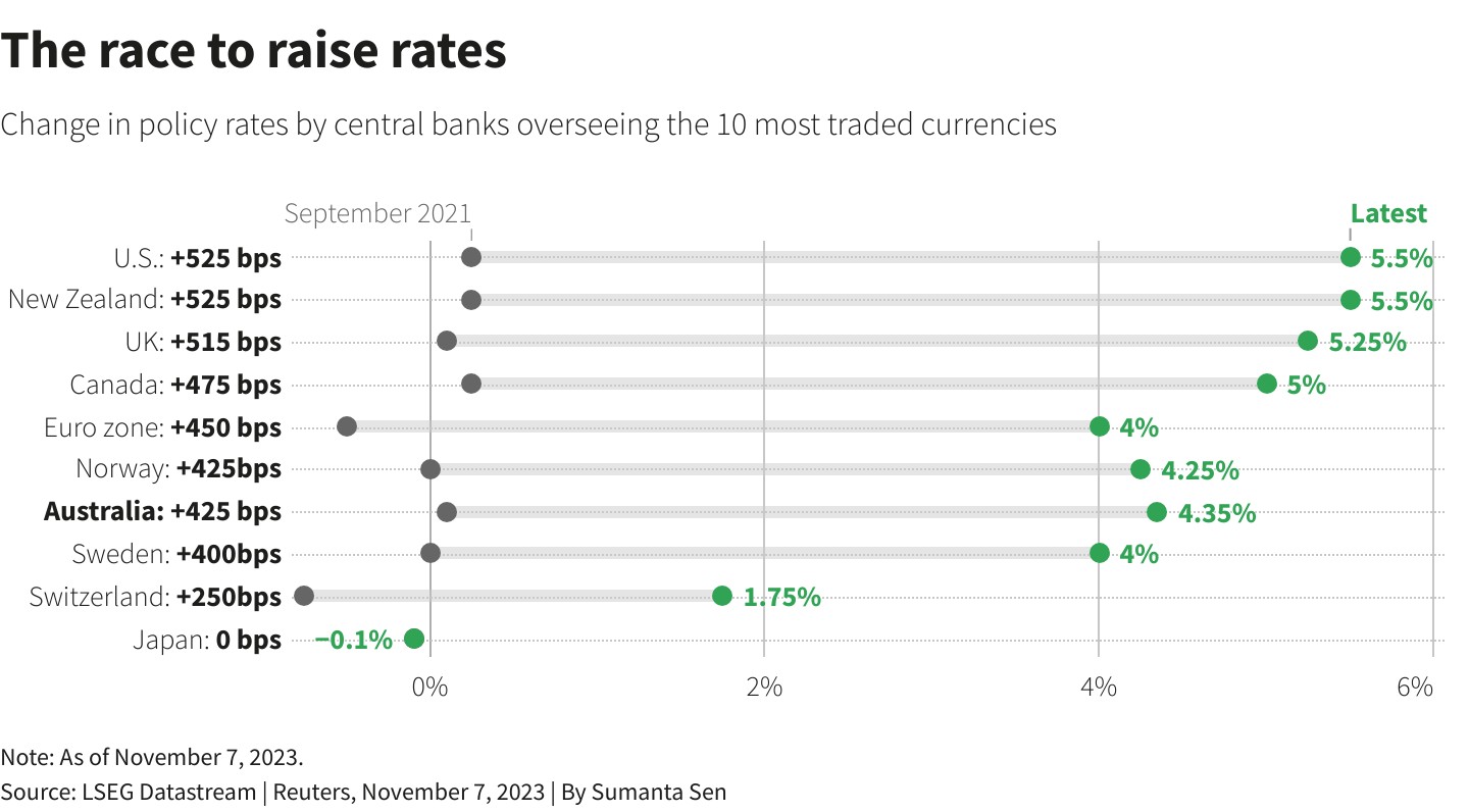这一点在日本表现得最为明显。美联储紧缩政策与日本央行坚持实施超宽松货币政策导致日元兑美元一度跌至33年低点,并引发了日本当局至少一轮干预。但随着美联储似乎已结束加息、日本央行可能将于明年结束负利率政策,日元兑美元汇率终于开始回升。