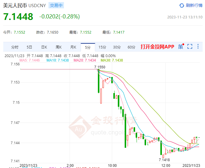 11月23日,人民币对美元中间价报7.1212,较前一交易日上调42个基点。前一交易日,人民币对美元中间价报7.1254。