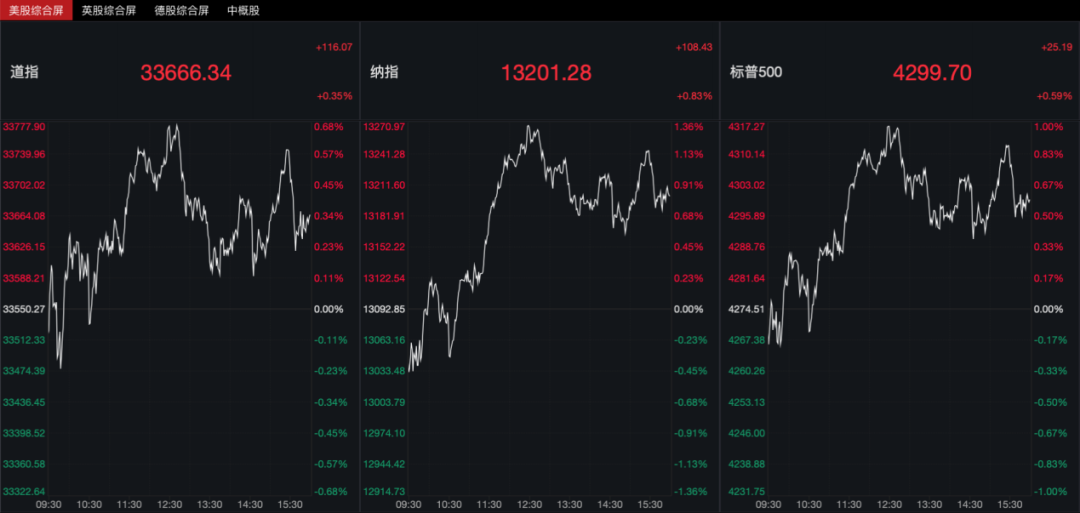 当地时间9月28日,美股三大指数低开后震荡走高,收盘时均上涨。数据显示,截至收盘,道琼斯工业指数涨0.35%,报33666.34点;标普500指数涨0.59%,报4299.70点;纳斯达克指数涨0.83%,报13201.28点。