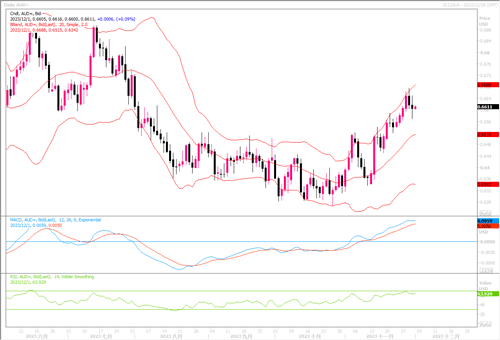 周四(11月30日),澳元/美元颇为震荡,当日最低曾去到0.6569,但收盘阶段有所拉升,最终收盘在0.6605水平。澳洲国内,周四的数据好坏参半,采矿业反弹推动澳洲第三季商业投资创下八年新高,建筑许可在10月份出现反弹,信贷供应的增长速度则有所放缓。而此前公布的10月份通胀不及预期,市场认为澳洲央行下周再次加息的可能性很小,明年加息的预期也有所下降。受上述市场因素影响,澳元近期的上升热潮有所减低。日内须关注的一项重要事件是鲍威尔的发言,要小心鲍威尔对市场预期不再升息的看法浇冷水,果真如此美元就有望继续反弹,澳元/美元恐会进入短线回落调整的走势。从日线图上观察,澳元/美元整体仍保持在上升轨道中,只是头部显得有点重,短线或面临回落调整的风险。但只要汇价保持在0.6500水平之上,澳元/美元后市仍有望继续攀高。