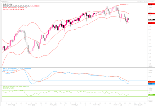 周四(11月30日),美元摆脱了显示美国通胀放缓迹象数据的影响勉强得到回升,当日美元/日元上涨0.6%,收盘在148.19。当日美国公布的个人消费支出(PCE)物价指数在9月份环比攀升0.4%后,10月份保持不变。10月PCE物价指数同比增长3.0%,为2021年3月以来的最小同比增幅,此前9月份的增幅为3.4%。虽然通胀情况继续显示有缓和,但缓和的幅度仍不大。因此,美元并未因此继续走弱。反而在月末交易员结清头寸的空头回补性交易扶持下,美元稍稍得到反弹喘息的机会。在日线图上,美元/日元已跌穿10、20、100日简单移动均线,各类技术指标仍处在下摆之中,没有显示转向的痕迹。且根据机构的观察,一年期远期掉期点继续收窄,11月30日达到781点,上回利差在类似水平时,美元/日元交投于137-139。后市只要该货币对持续受压于149.00之下,料美元/日元近期形成的下跌走势将会延续下去。