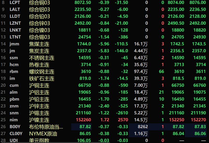 黑色系均飘绿,铁矿跌1.74%,螺纹跌0.88%,热卷跌0.91%,不锈钢跌0.31%。双焦均大幅下挫:焦煤跌5.96%,焦炭跌5.83%。