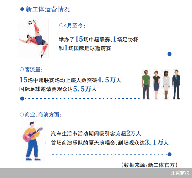 同时,新工体还在商业、商演等方面进行了初步尝试。5月下旬,新工体首次尝试“策展+商业”融合模式,举办汽车生活节,活动期间吸引客流超2万人,汽车交易意向金约5600万元,集市销售流水62.8万元;新工体举办首场商演乐队的夏天演唱会,到场观众达3.1万人。