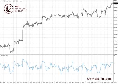 标普500处于长期的上行通道内,相对强弱指标高于70意味着短期内可能出现小幅回调, 只要维持在4500上方,就会打开更多上行空间。