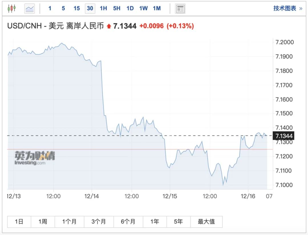 拉长周期来看,今年11月初,离岸人民币兑美元报7.3415,此后人民币持续升值,截至12月15日,离岸人民币兑美元累计涨超2000点,累计升值幅度超2.8%。