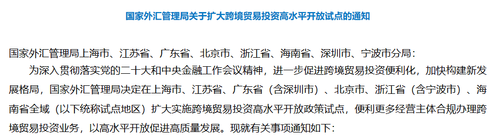 国家外汇管理局网站12月15日消息,根据中央金融工作会议部署要求,为进一步促进跨境贸易和投融资便利化,日前,国家外汇管理局在总结前期试点经验的基础上,决定将试点地区扩大至上海市、江苏省、广东省(含深圳市)、北京市、浙江省(含宁波市)、海南省全域等地区(以下统称“试点地区”),复制推广前期试点效果良好的外汇便利化政策措施。
