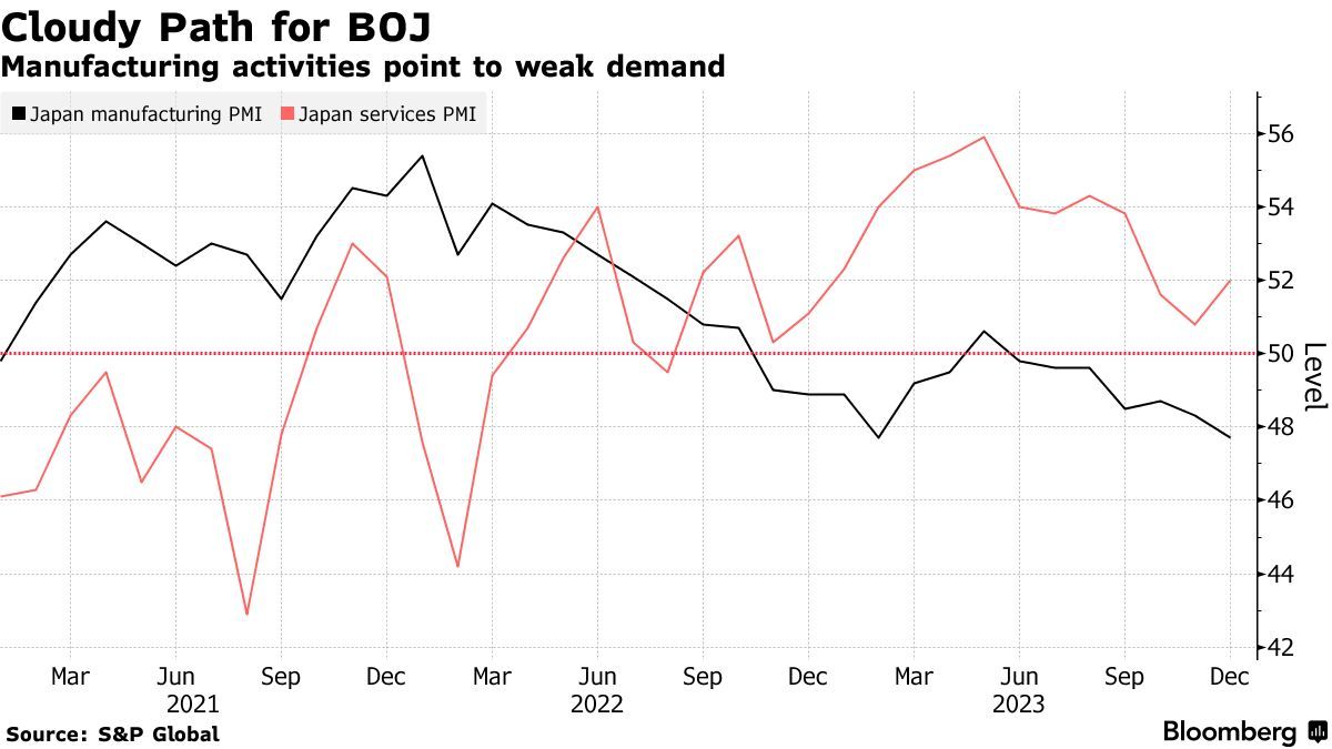 此外,日本制造业采购经理人指数(PMI)在12月降至47.7,为2月以来的最低水平,与2020年9月日本经济刚刚开始摆脱新冠疫情时期的水平相当。统计数据显示,该指数已连续7个月低于50这一荣枯分界线,这一重要的制造业数据使得日本央行明年终结长期以来负利率的潜在举措面临不确定性。
