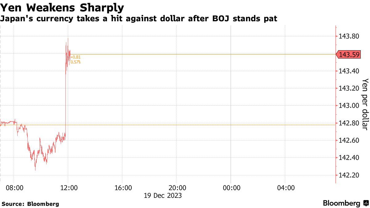 由于日本央行未释放任何宽松信号,市场也顺势回应:日元汇率(美元兑日元)从决定前的142.64日元左右一度贬值至143.79日元。日本央行此举令押注日元汇率上行的投资者们感到失望,他们押注日本央行将出人意料地提前加息,或者至少发出提前加息的信号。上周,在美联储暗示将在2024年转向宽松货币政策后,日元汇率(美元兑日元)一度触及四个月高点。日元稍早的涨势减轻了植田和男面临的部分压力。在最近几次会议上,植田和男曾面临将日元推低至30年来新低的风险。