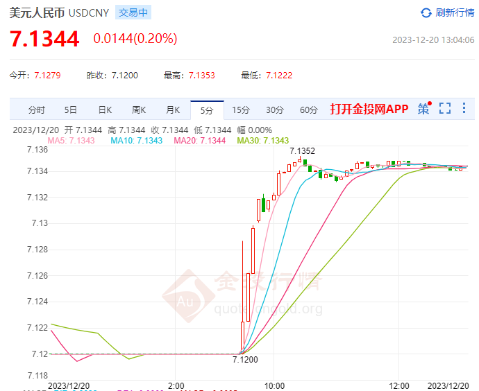 美元兑离岸人民币刚刚触及7.1300元关口,最新报7.1300元,日内涨0.12%。