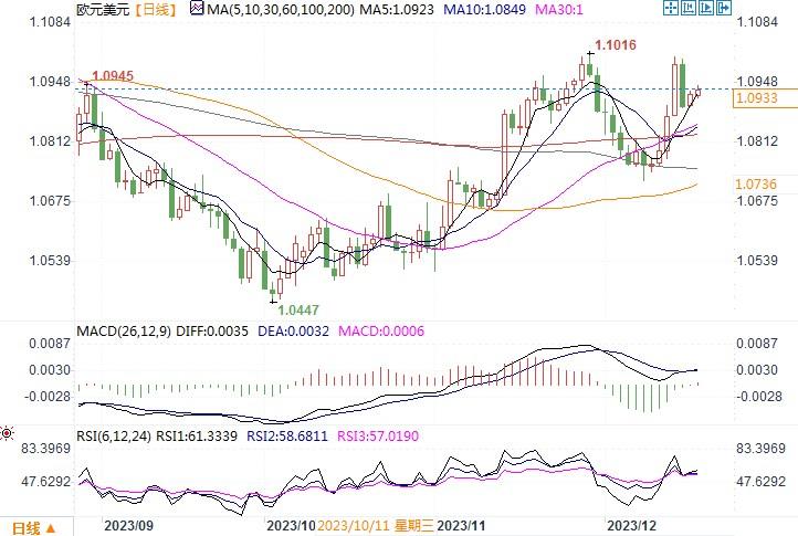 KBC markets表示:“11月底欧美测试1.10未成功,因为市场认为欧洲央行有可能软化立场,将欧美拉回1.0725区域。”