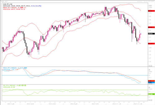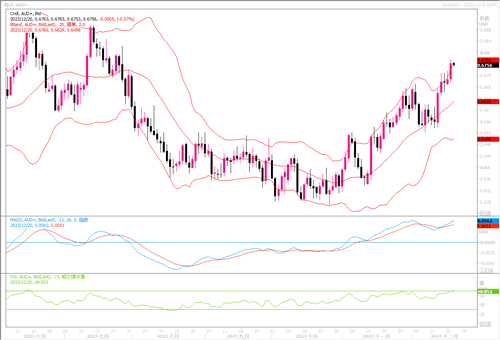 周二(12月19日),澳元/美元延续长期涨势继续冲高,当日收盘在0.6761,上涨0.79。澳洲央行12月份政策会议的会议记录显示,澳洲央行曾考虑在12月连续第二个月加息,但认为通胀方面有足够的鼓舞人心的迹象,因此需要暂停等待更多数据。市场在此次会议之后降低了对澳洲央行进一步加息的预期,在一定程度上也受美联储最近转向鸽派影响。期货市场走势显示,决策者在明年2月开会时再次加息的可能性为6%,明年年底前将降息两次。会议记录还显示,委员们还一致认为,澳洲央行目前持有公债至到期的做法仍然是适当的,但同意继续积极考虑提前出售债券的可能性。走势形态仍紧贴布林带通道上轨线呈上行趋向,各类技术指标仍保持上扬态势。显示澳元多头仍占优。目前下方初步支撑在0.6650附近,上方若进一步上攻的初步目标将瞄向0.6800。