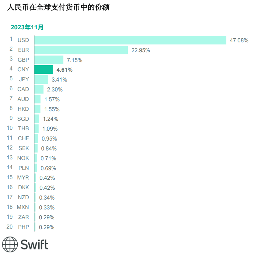 2023年11月,人民币在全球支付货币中的份额从上月的3.60%升至4.61%,并在当月排名中超过日元,位列第四。11月份日元在全球支付货币中的份额从上月的3.91%降至3.41%,位列第五。