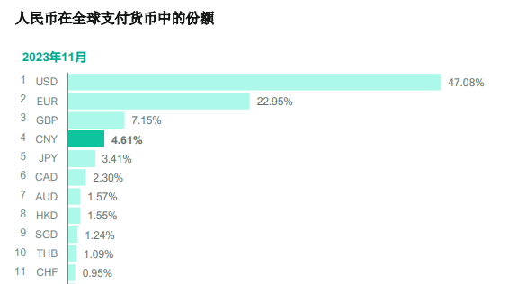 环球银行金融电信协会(Swift)最新发布的人民币月度报告和数据统计显示,人民币成为第四大全球最活跃货币,占比4.61%,刷新历史纪录。
