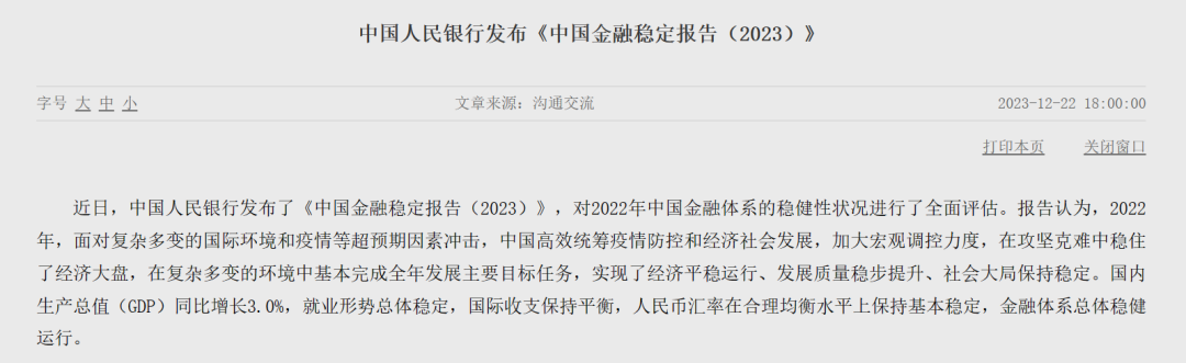 中国人民银行网站12月22日消息,近日,中国人民银行发布了《中国金融稳定报告(2023)》,对2022年中国金融体系的稳健性状况进行了全面评估。