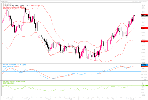 周四(12月21日),澳元/美元盘中在触及0.6803高位后,最终高收盘在0.6800,全日涨1.04%。周四公布的数据显示,美国第三季度经济增长并不像原先预期的那么强劲,吃紧的劳动力市场正出现裂痕。这让投资者感到松了口气,说明美联储上周暗示的路径不会很快改变。为此,美国股市周四收涨,收复了前一天的大部分失地,经济数据提振了对美联储将放松货币政策的乐观情绪,令投资者的风险胃纳改善。风险偏好情绪改善,也是令澳元从中受益而走高。日线图上,澳元/美元略低于关键阻力位0.6819,即2023年高点/低点的61.8%回档位,若突破0.6820,则目标指向三重顶部0.6895/0.6900。目前5、10和21日均线呈看涨排列,各类技术指标呈强势上扬态势,显示澳元多头动能较强。当前的支撑位在周四的0.6720和10日均线0.6697。小心留意周五晚间美国核心个人消费支出(PCE)物价指数出炉带给市场的波动影响。