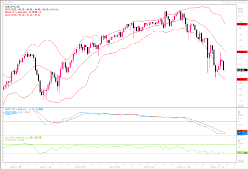 周四(12月21日),美元兑一篮子货币周四触及一周最低,受助于美元的下跌,日元当日上涨0.93%,收盘于142.10。周四稍早的数据显示,第三季度美国国内生产总值(GDP)环比增长年率下修为4.9%,前值为5.2%。第三季GDP中的消费者支出下修至增长3.1%,前值为增长3.6%。该数据虽影响有限,但还是引发市场对于明年降息一定的遐想。因为,美联储上周维持利率不变,决策者在新的经济预测中暗示,过去两年中历史性的货币政策紧缩行动已经结束,2024年将降息。因此经济数据尤其是反映通胀方面的数据若持续出现低落的迹象,都将催生降息的预期。投资者目前正在等待周五的美国核心个人消费支出(PCE)物价指数。如果11月的PCE物价指数环比上升0.1%,那么六个月的年化通胀率将降至2.1%,几乎达到美联储2%的目标。一些投资者预计,通胀放缓将促使美联储放宽政策,以阻止实际利率上升,并押注美联储会尽早采取激进行动。美元利率将会下降的预期,这对于日元来说应该是利好,也将成为刺激日元走升的一大主要影响因素。而且日本政府周四略微上调了本财年的经济增长预期。这也或许有助于日本央行有望明年结束负利率。日线图上,美元/日元隔夜一根大阴柱,几乎将之前的美元空头回补的升幅消蚀殆尽。整体走势继续维持在下降通道内。若周五的PCE物价指数呈下跌,那么美元/日元将继续下探低位。但需谨慎防范数据强劲所带来的报复性反弹风险。