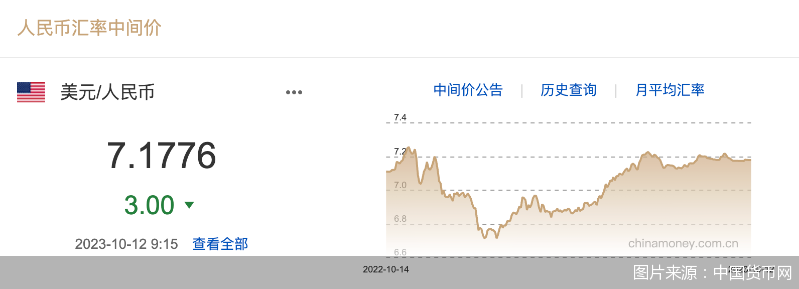 讯(记者廖蒙)10月12日,人民银行授权中国外汇交易中心公布,2023年10月12日银行间外汇市场人民币汇率中间价为:1美元对人民币7.1776元,前一交易日中间价报7.1779元,单日调升3基点。人民币中间价连续四个交易日小幅升值。