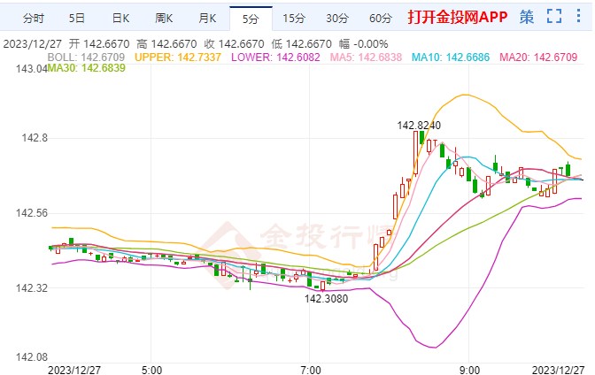 美元/日元货币对在周三(12月27日)亚洲早盘迎来了新的买盘浪潮,日本央行(BoJ)发表意见摘要后,该货币对已达到142.84,目前交投于142.60附近,在2023年最后一周交易量清淡的情况下,市场可能会保持安静,日元仍面临沉重抛售压力。
