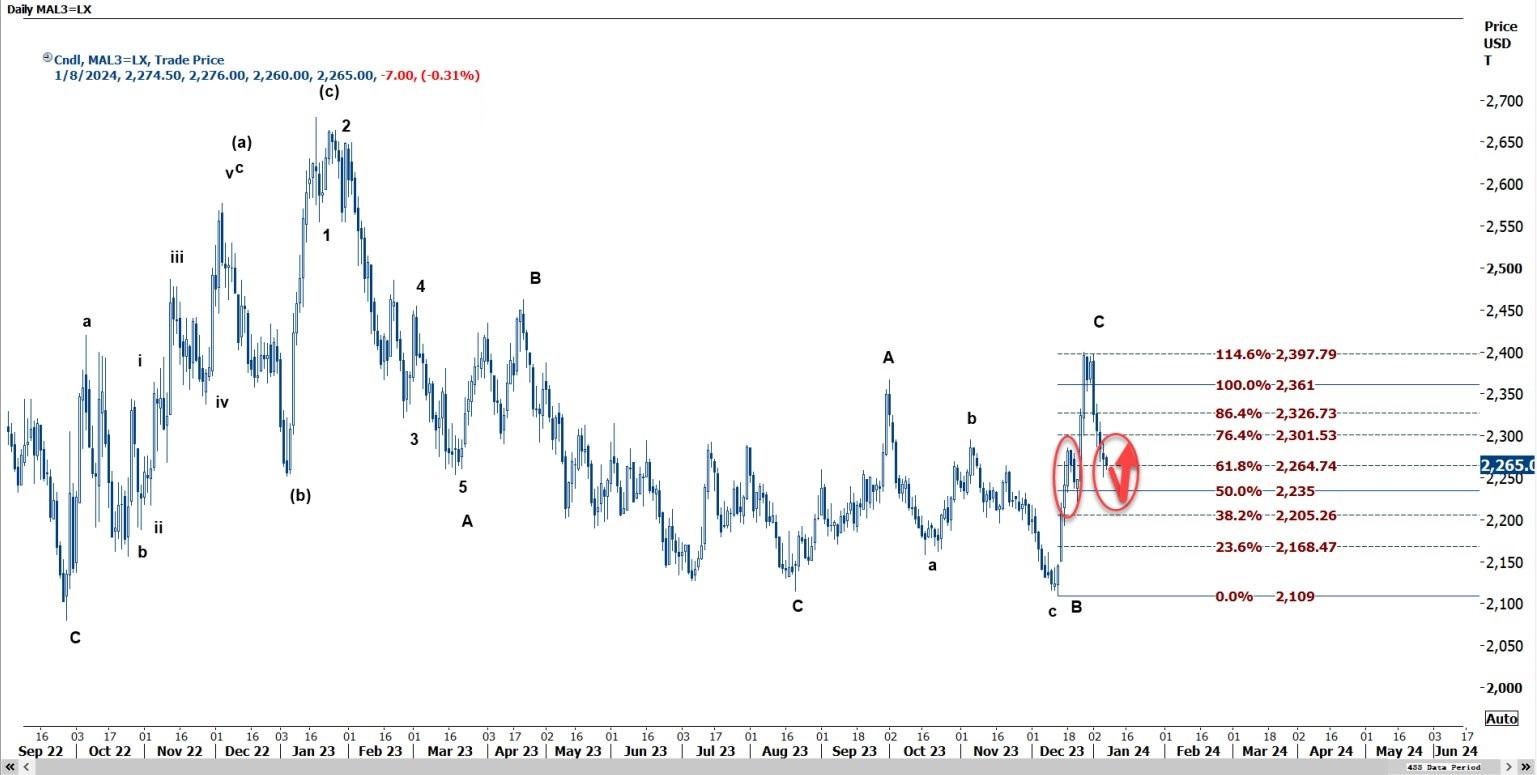 LME铝合约CMAL3本周可能会在每吨2235-2302美元之间盘整,然后跌向2109美元或上涨至2398美元。
