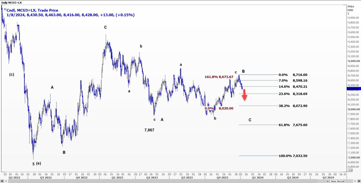 此前从2023年10月23日低点7856美元的上涨可能是由c浪推动的,c浪是自2023年5月24日低点7867美元以来横盘形态的第三波。