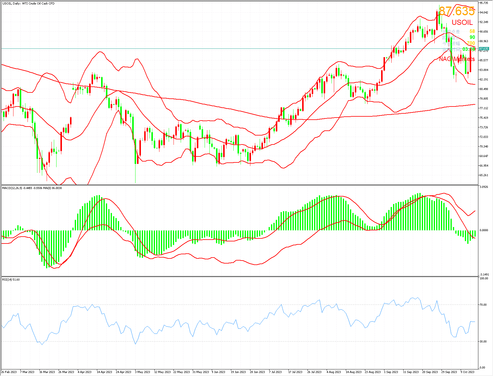 原油方面,周五油价大涨超过5%至87.677美元/桶位置,受助于地缘局势再度恶化,美国已向以色列派遣两个航母舰队,巴以冲突的升级使投资者担忧中东的能源供给,油价因此大涨。后市来看短线油价仍受地缘局势影响,短线或趋向震荡,投资者需留意风险。