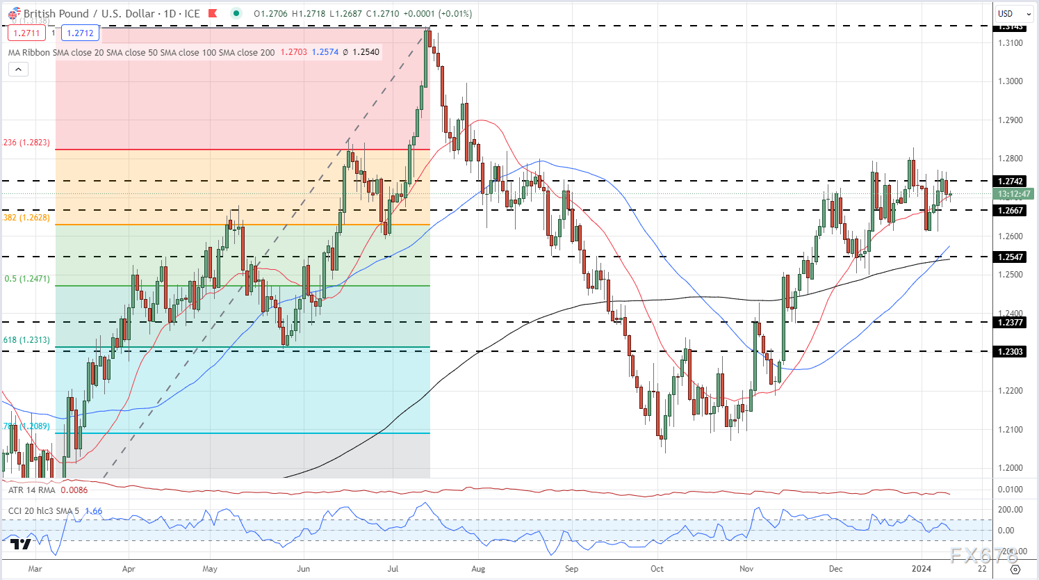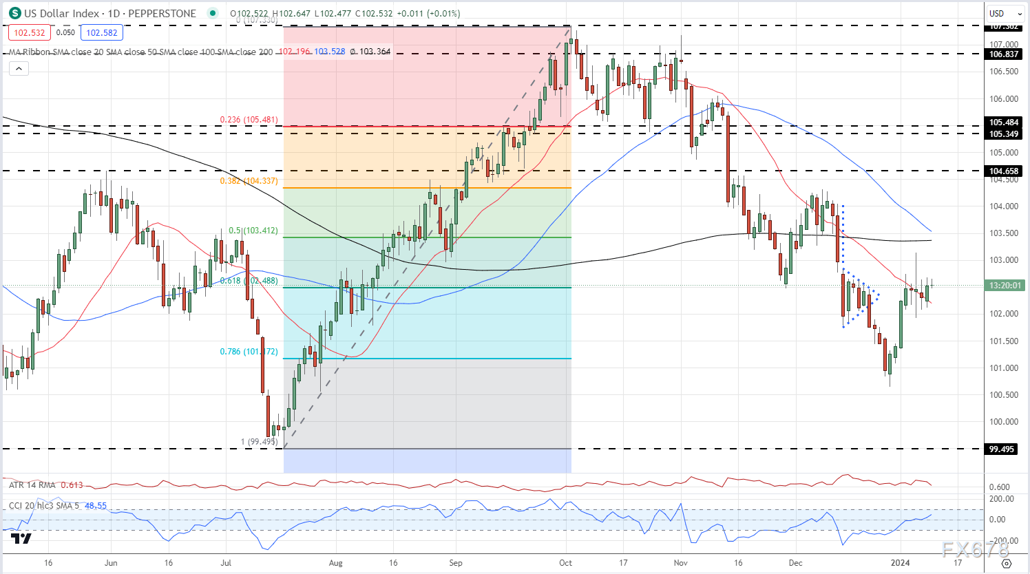 美元指数日线图显示,美元指数处于短期盘整阶段,并受到上周五就业报告的限制。日线图显示了一组相互矛盾的移动平均线,20日移动均线目前支撑美元指数,而50日和200日移动均线预计将在未来几天形成一个“死亡交叉”。美元指数位于7月中旬至10月初的61.8%斐波那契回撤位位置。CCI指标则指向更高,但仍处于中性区间。