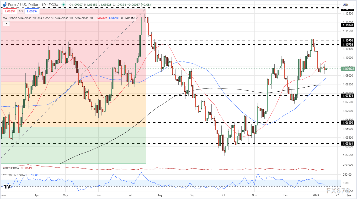 欧元/美元走势图走势悲喜参半,当前价格徘徊在20日和50日/200日移动均线之间。与英镑兑美元一样,上周出现了一个“黄金交叉”,为该货币对提供了支撑,CCI指标为中性。初步支撑位在1.0900附近。