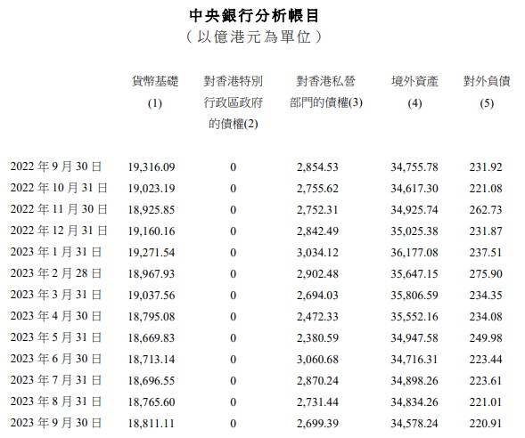 10月13日,香港金管局公布外汇基金在2023年9月底的主要分析帐目。在9月份,外汇基金的境外资产减少256亿港元,至34,578亿港元;货币基础为18,811亿港元,包括负债证明书、政府发行的流通纸币及硬币、银行体系结余,以及已发行外汇基金票据及债券;外汇基金对香港私营部门的债权总额为2,699亿港元;对外负债总额为221亿港元。