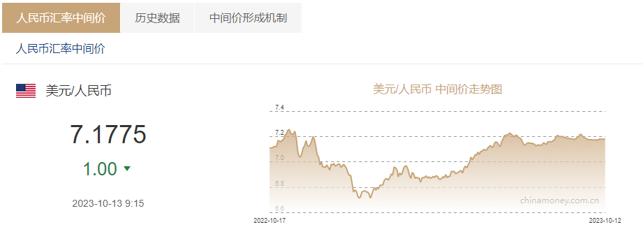 10月13日消息中国外汇交易中心显示,13日,人民币对美元中间价报7.1775,调升1个基点。